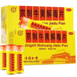 【批准文号】国药准字Z11020472请仔细阅读(同仁堂 京制牛黄解毒片 0.6g*8片*10瓶)的作用说明,并在药师指导下购买和使用。【药品名称】通用名称:京制牛黄解毒片汉语拼音:Jingzhi Niuhuang Jiedu Pian【成份】黄连、黄柏、石膏、金钱花、薄荷、桔梗、连翘、大黄、黄芩、